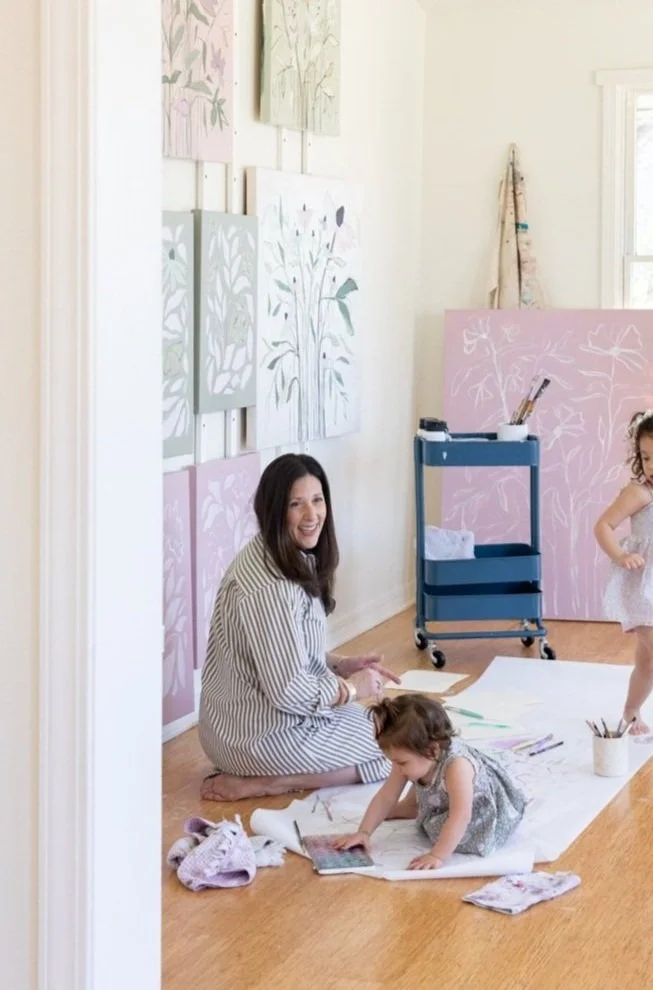 As an abstract-focused artist and mother, I’m always seeking to bring more play and curiosity into our days. My bright and cheerful studio is nestled in the city of Fayetteville, Arkansas— and seen right when you walk in my front door! This placement naturally causes my home life and professional work to mix, allowing my daughters to make a mess right alongside me.